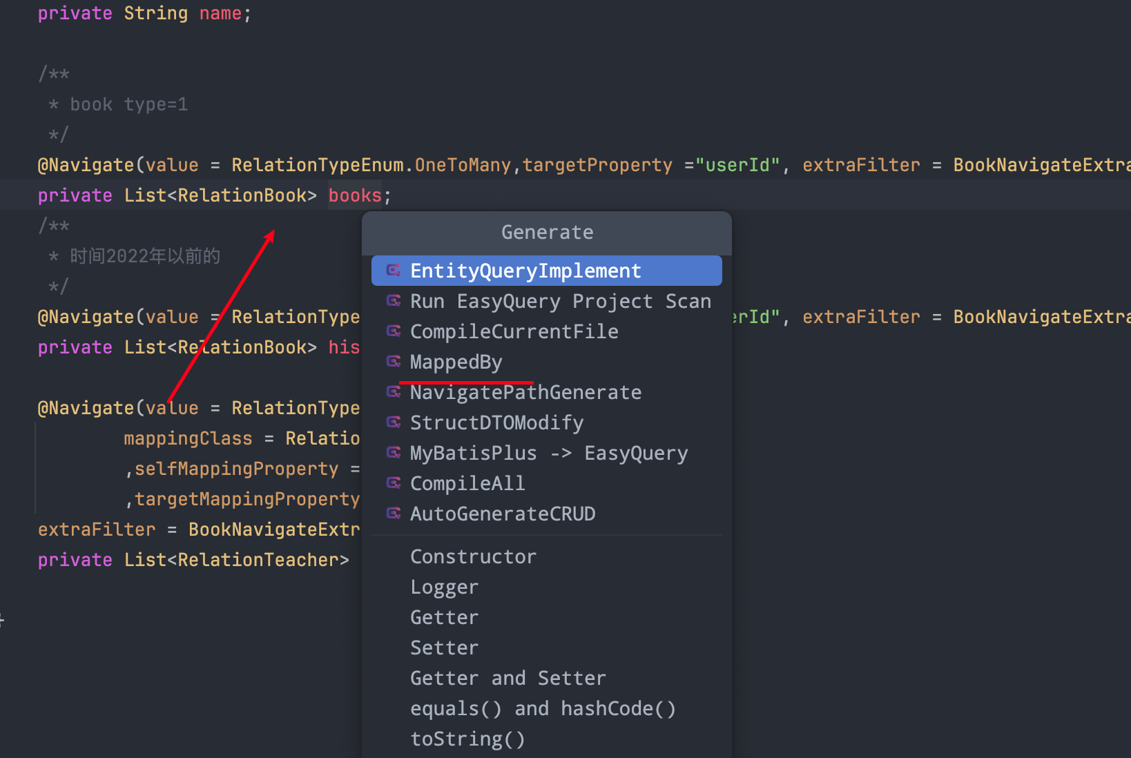 @Navigate(value = RelationTypeEnum.OneToMany, selfProperty = {UserProxy.Fields.id}, targetProperty = {CommentProxy.Fields.userId})